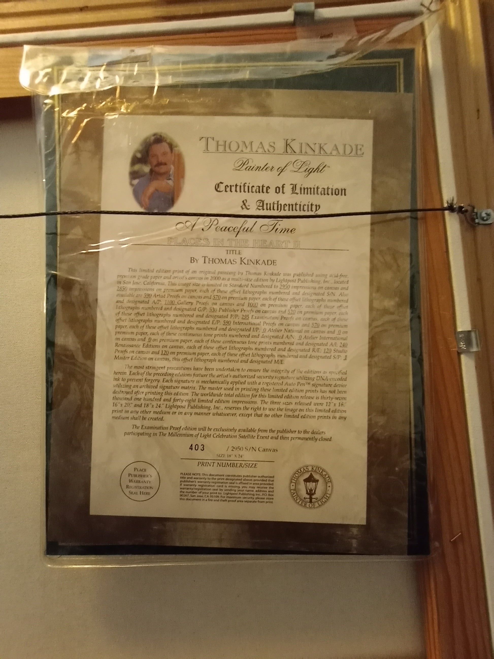 Artistic Style and Themes: Kinkade's paintings typically featured landscapes, cottages, and scenes from American life, emphasizing light to convey a sense of peace, nostalgia, and comfort. His work has been described as kitsch by some art critics due to its sentimental and mass-produced nature.